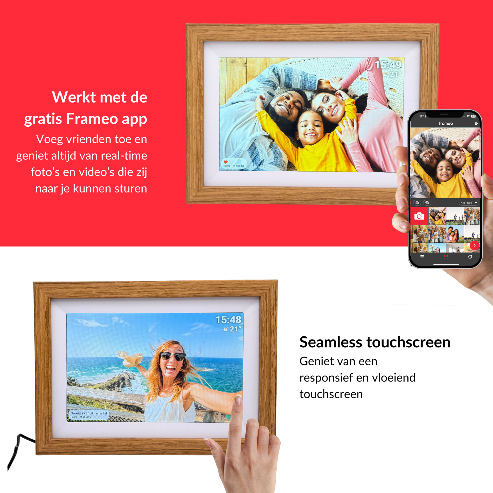 Onze lijst werkt op Frameo software. Frameo is hét programma voor digitale fotolijsten. Je kunt de Frameo app makkelijk downloaden op je telefoon en moeiteloos foto's naar de digitale fotolijst sturen. Dit werkt voor een onbeperkt aantal gebruikers en zonder extra abonnementskosten.